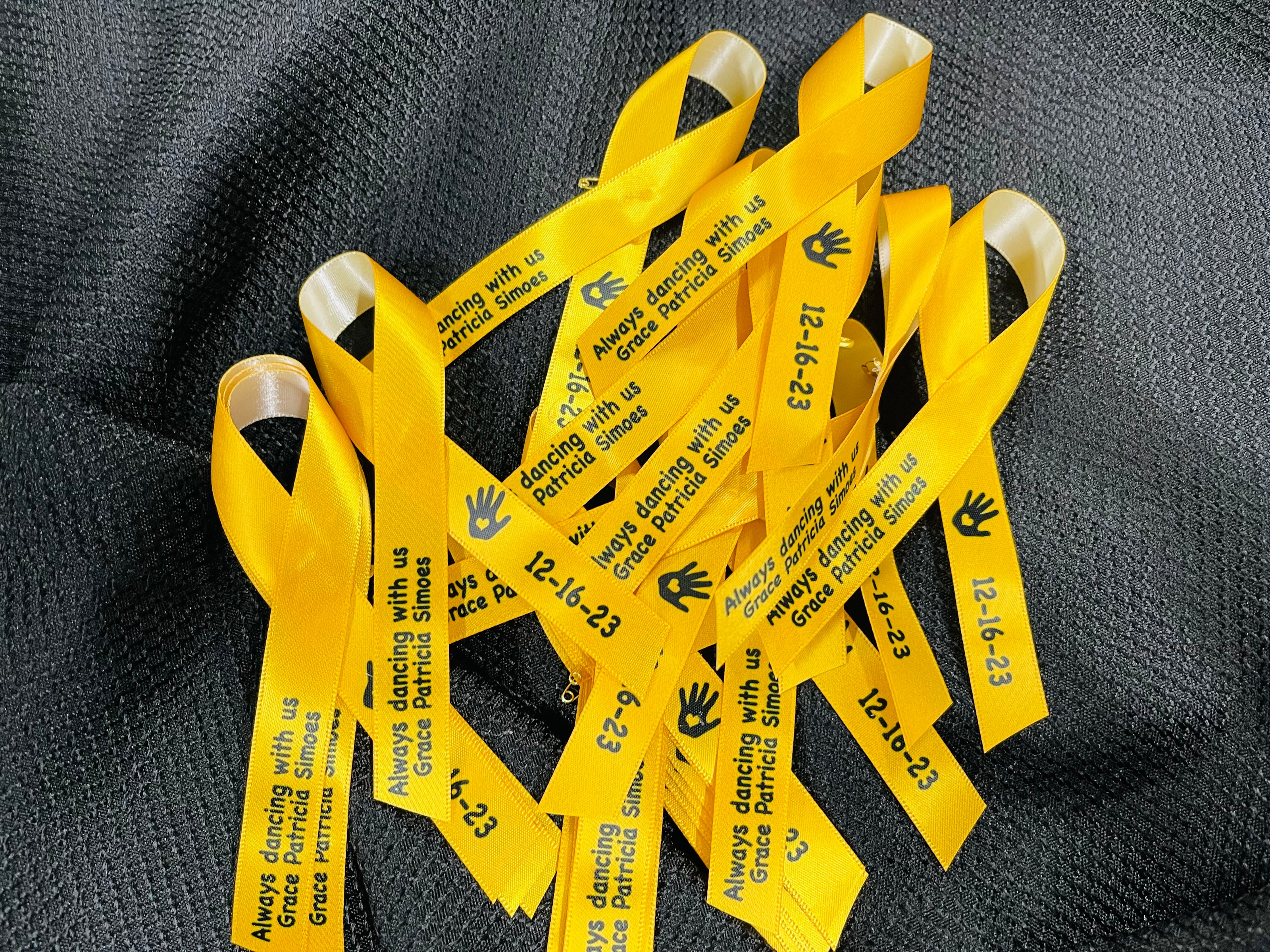 Childhood cancer ribbons (yellow cancer ribbon) with 3 lines of personalized text.