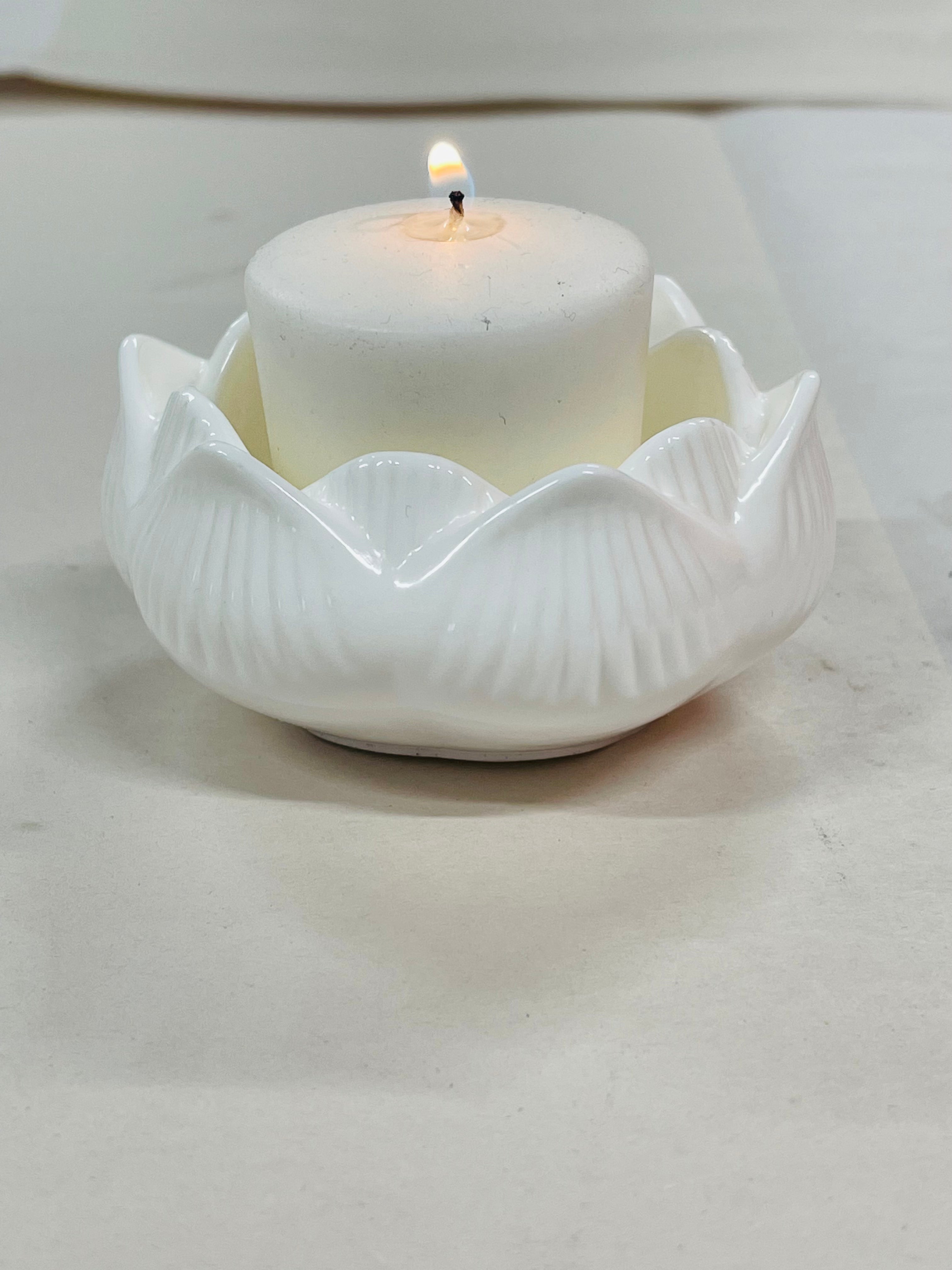 Floral shaped tea light memorial candle holder creates an interesting presentation with a small wax candle set in the center.