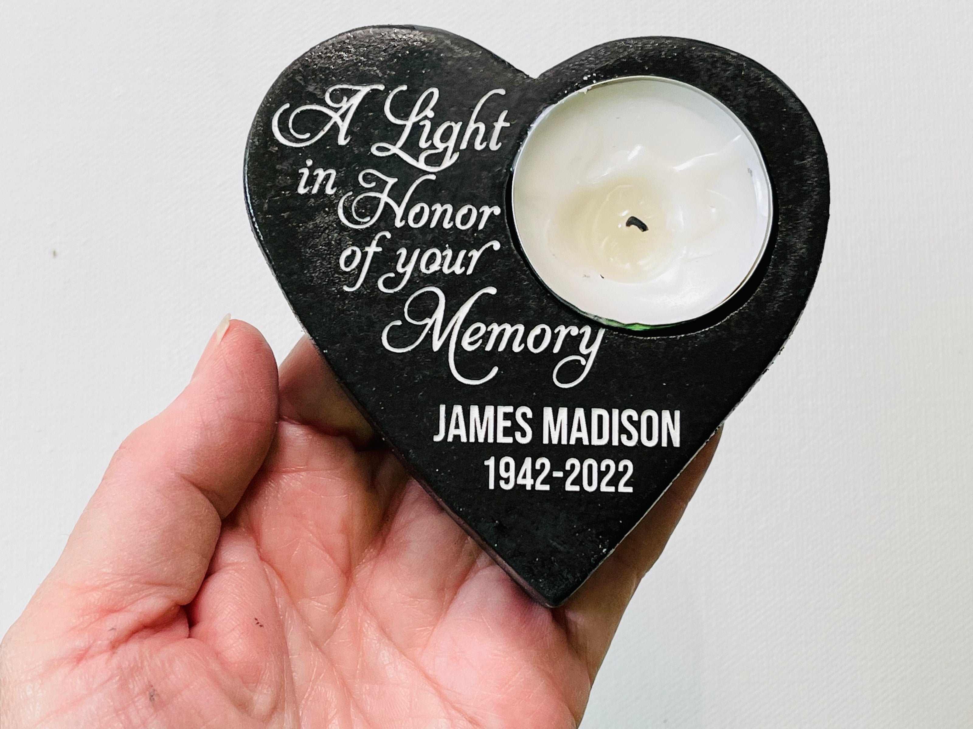 Heart shaped stone memorial tea light candle holder includes 1 tea light wax candle. Engraved to perfection with a short poem quote and your name and years. A perfect little keepsake to light in honor of a loved one.