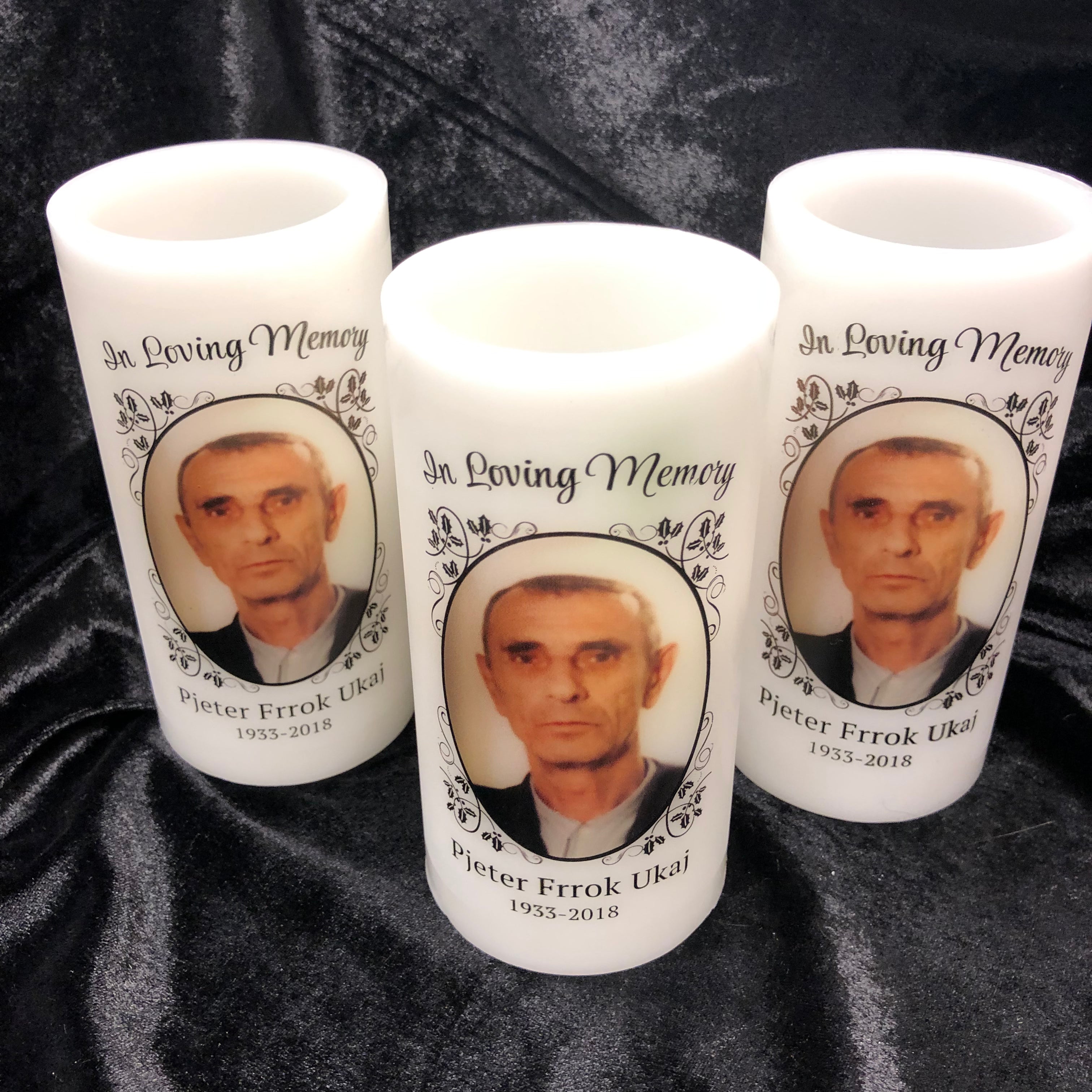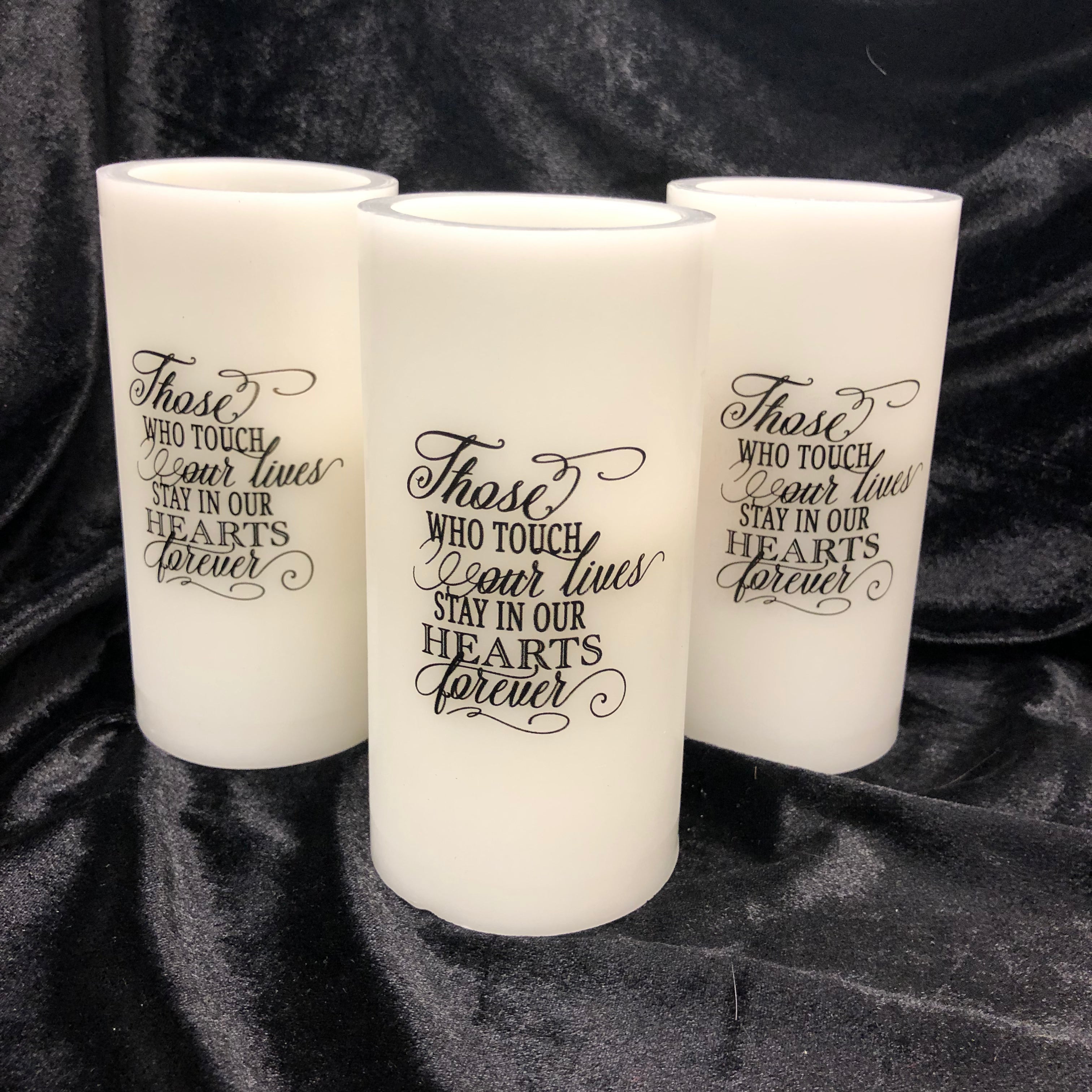 You can find our memorial candles in wax, LED or glass styles in varying sizes. Our unique imprinting technique sets us apart and produces a professional and durable memorial keepsake. Select from our large collection of memorial candles which makes an ideal gift or keepsake for everyone. LED candles includes batteries are ready for lighting. Memorial candles are available in a variety of styles, sizes and designs.