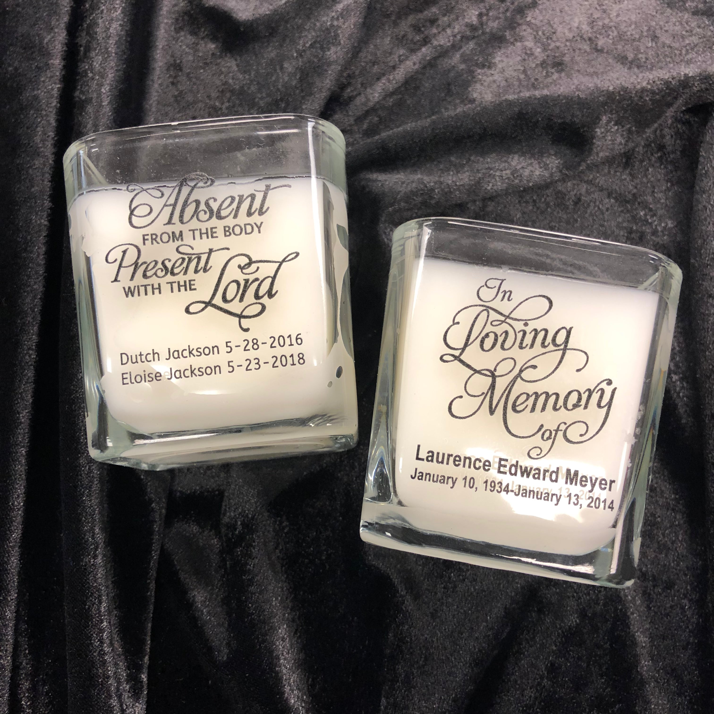 Square glass memorial candles with wording of your choice. Pre-poured wax already included and ready to light a memory. Illuminate a memory with our square glass memorial candles, pre-poured with wax and ready to light.