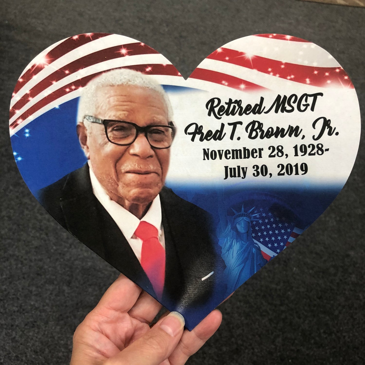 Patriotic background with U.S. flag makes a wonderful design for your personalized folding memorial fans.