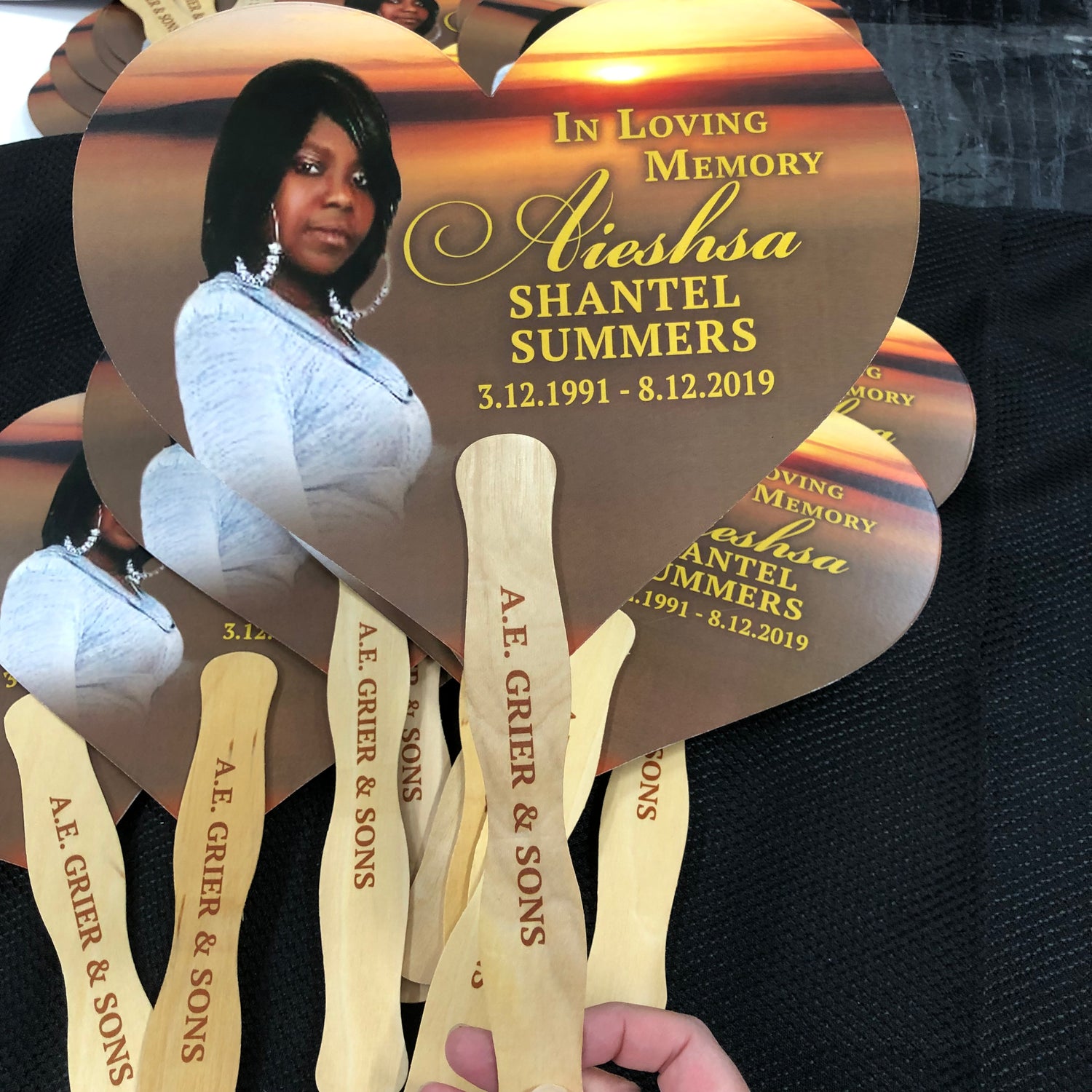 The design of these hand fans often includes personal touches that celebrate the individual’s life. Common elements feature photographs of the deceased, along with their birth and death dates, and may include meaningful quotes, poems, or excerpts from favorite songs. This personalization turns each fan into a unique tribute to the deceased, making it a deeply significant part of the service. It allows attendees to reflect on the life and legacy of their loved one while providing some physical comfort during the ceremony.
