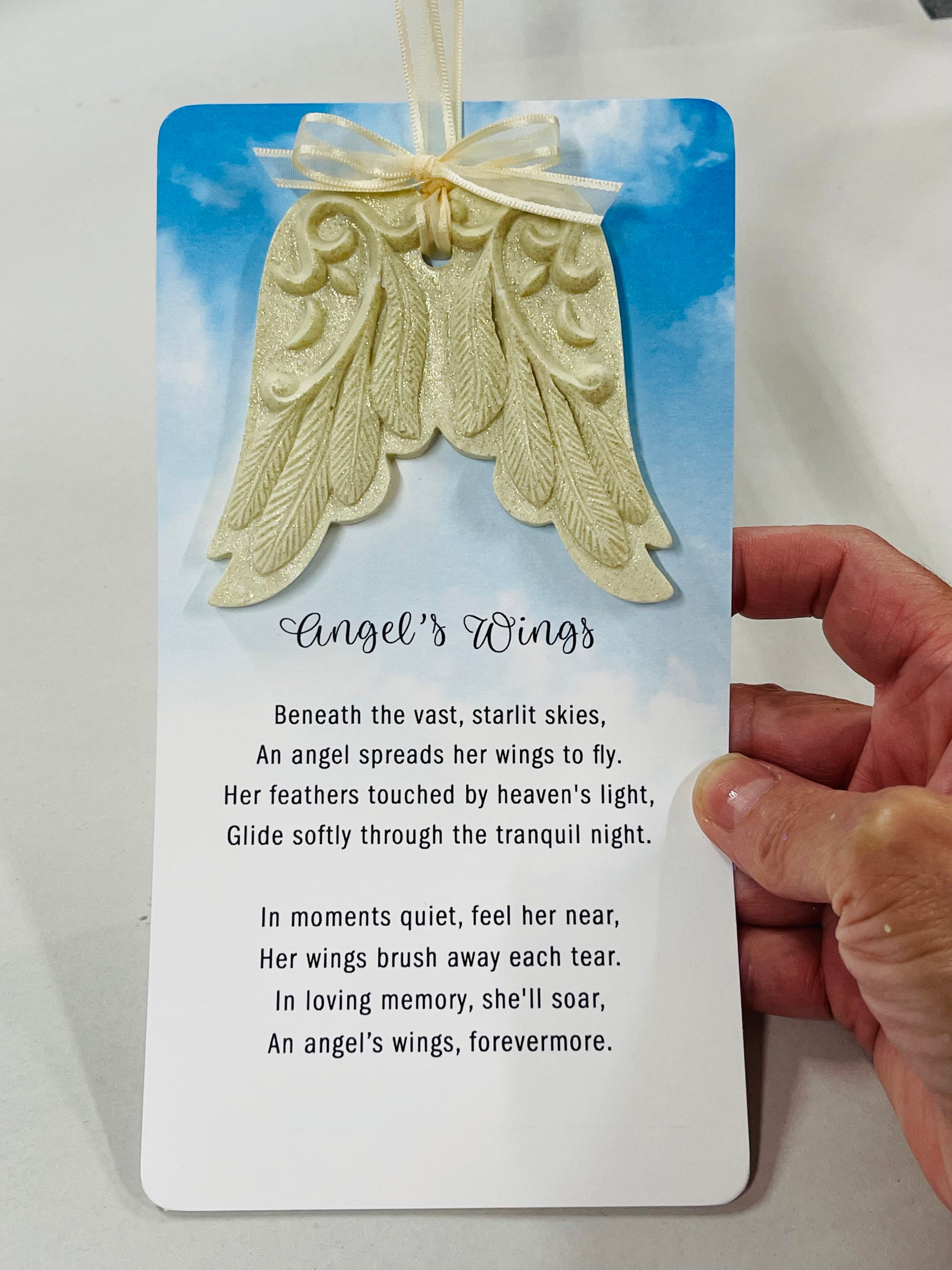 The Angel's Wings Memorial Charm and Card is a heartfelt keepsake designed to honor and remember loved ones who have passed. The delicate charm features intricately detailed angel wings, symbolizing peace, love, and eternal remembrance. It comes with a beautifully crafted card, which includes a comforting message to help provide solace during times of grief. Perfect for memorial services, funerals, or as a thoughtful gift, this meaningful combination serves as a gentle reminder that those we love are always with us in spirit. A timeless treasure to carry with you, offering comfort and a sense of connection to those who are no longer physically present.