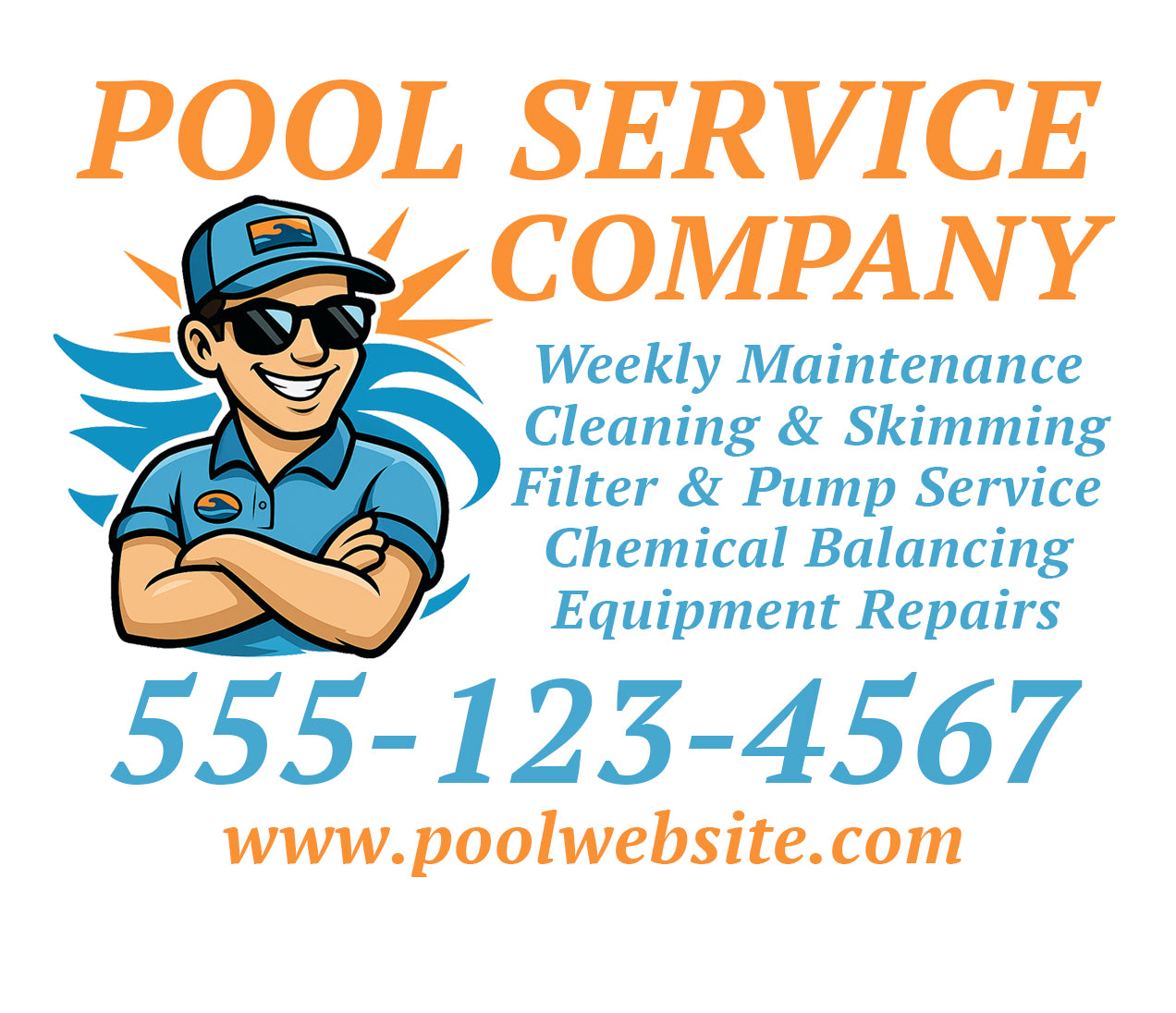 This bold and eye-catching Pool Service Company Car Magnet Sign is the perfect mobile advertisement for your business. Designed with a cheerful cartoon technician, the sign includes essential services such as weekly maintenance, cleaning and skimming, pump service, and more. The vivid color palette of orange, blue, and white ensures visibility and professional appeal on any vehicle.