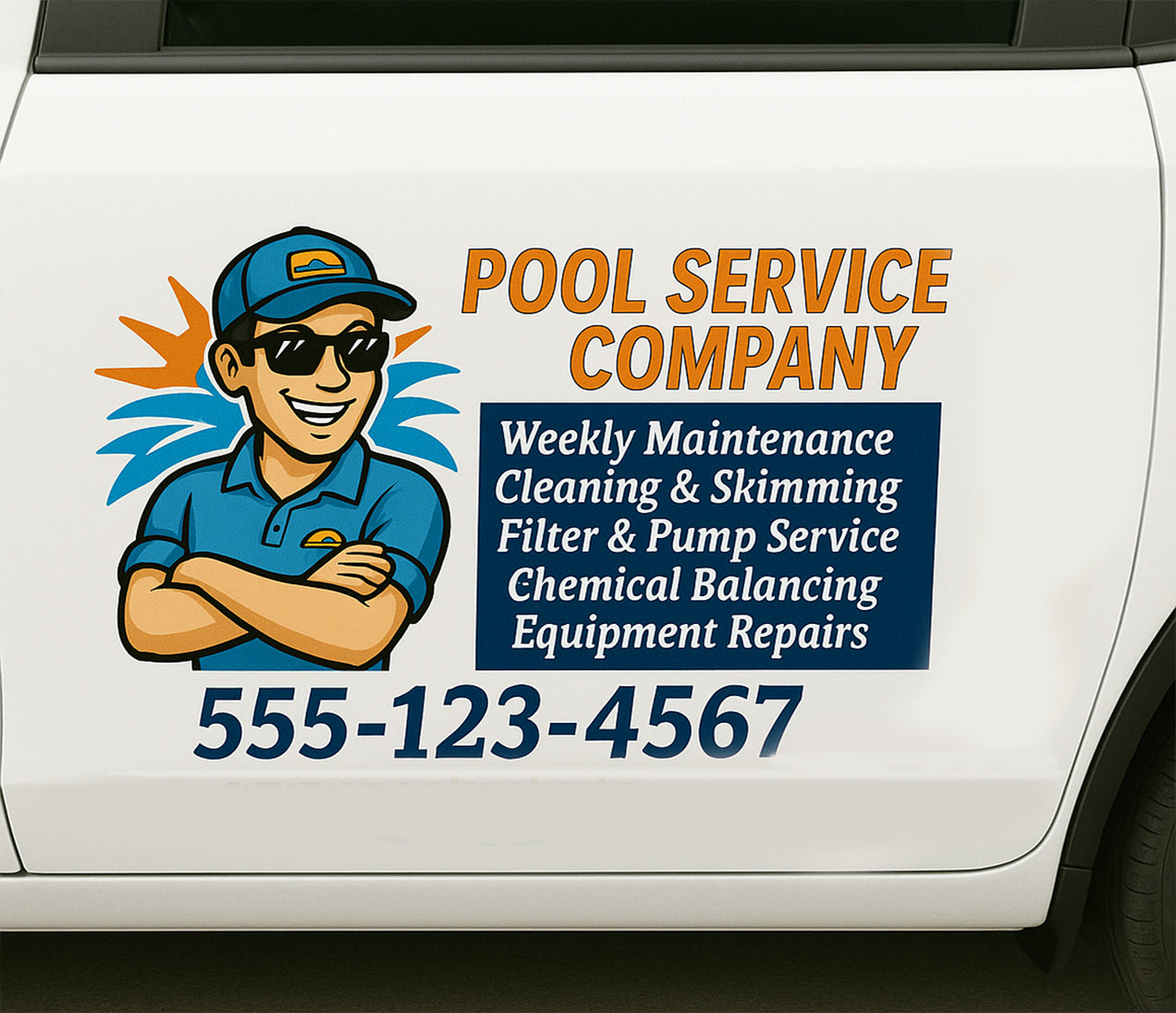 The Pool Service Company Car Magnet Sign communicates your offerings clearly and memorably, featuring your phone number and website in large, legible text. Easy to apply and remove, the Pool Service Company Car Magnet Sign is ideal for daily use, helping build brand recognition wherever your service vehicle goes.